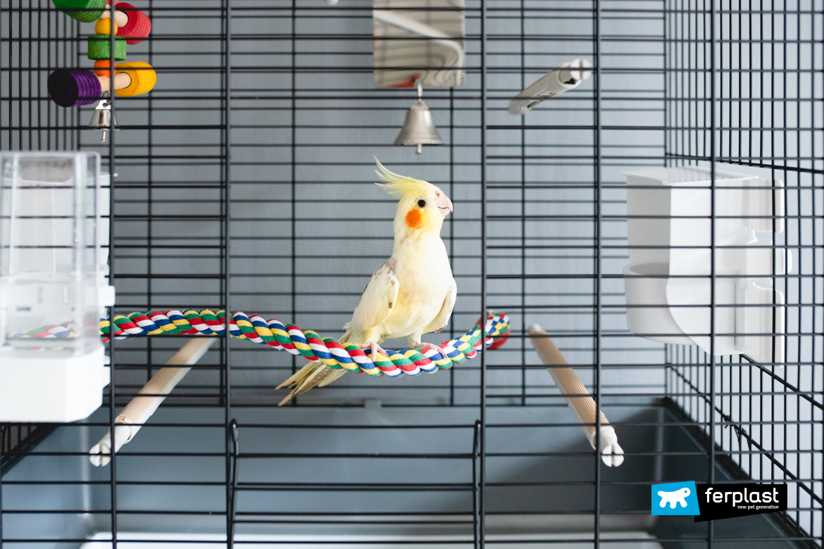 قفس: حداقل 60×60×90 سانتیمتر با میلههای افقی و فاصله 1-1.5 سانتیمتر.